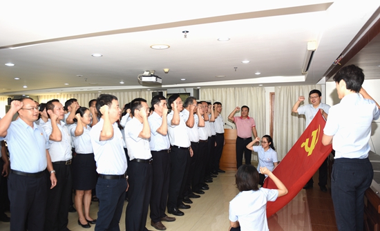 上午8時30分,宣誓儀式開始,全體黨員干部佩戴黨徽,面向黨旗莊嚴(yán)宣誓。“我宣誓:我志愿加入中國共產(chǎn)黨……對黨忠誠,積極工作,為共產(chǎn)主義奮斗終身……” 公司黨委專職副書記王修奮作為領(lǐng)誓人,右手舉拳,領(lǐng)誦誓詞,其他宣誓人列隊站立,跟誦誓詞。宣誓人員鏗鏘有力地將自己的名字鄭重落在了忠于黨,忠于人民,為共產(chǎn)主義奮斗終身的錚錚誓言上。